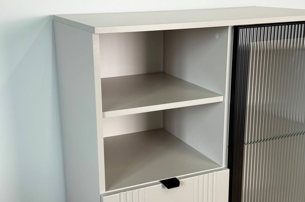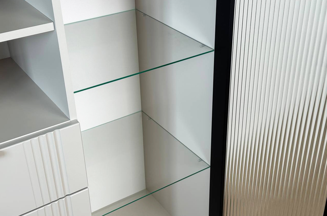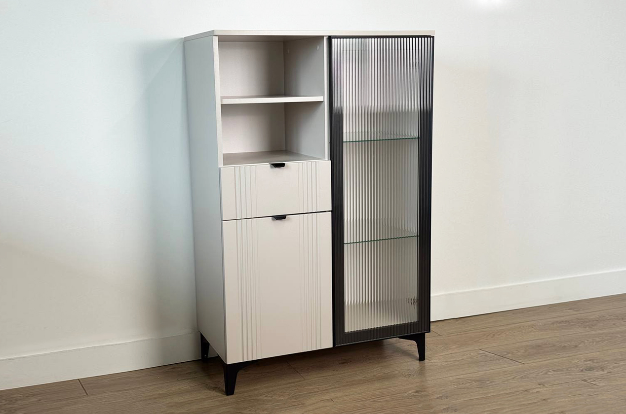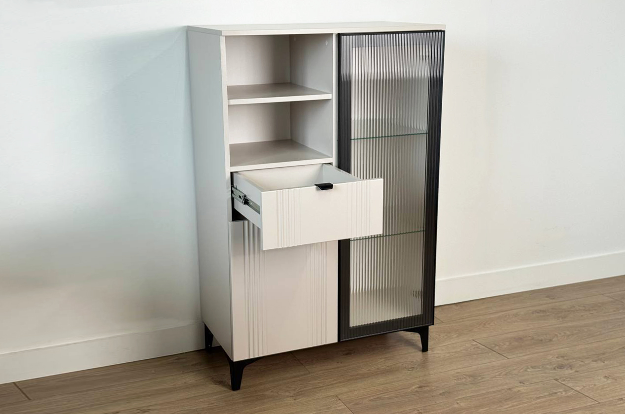 • • Многофункциональное хранение: Вмещает всё необходимое благодаря комбинации секций: зона за стеклом, открытая полка, удобный выкатной ящик и закрытое отделение.