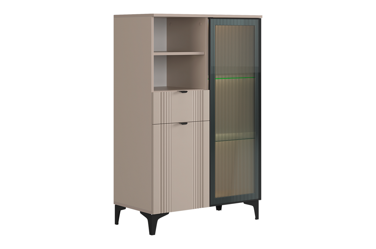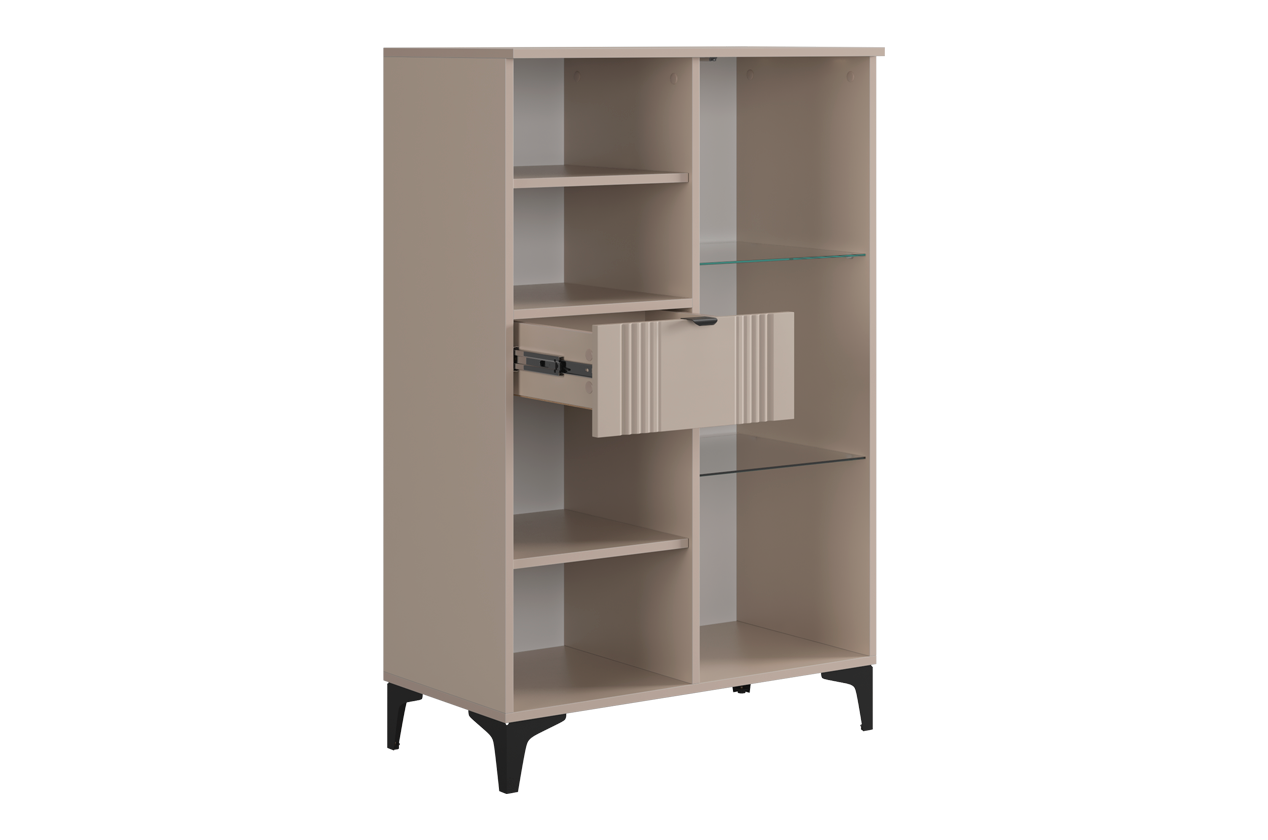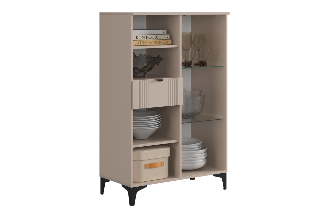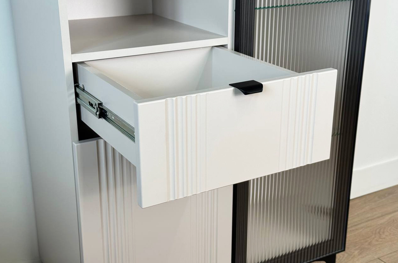 • • Многофункциональное хранение: Вмещает всё необходимое благодаря комбинации секций: зона за стеклом, открытая полка, удобный выкатной ящик и закрытое отделение.