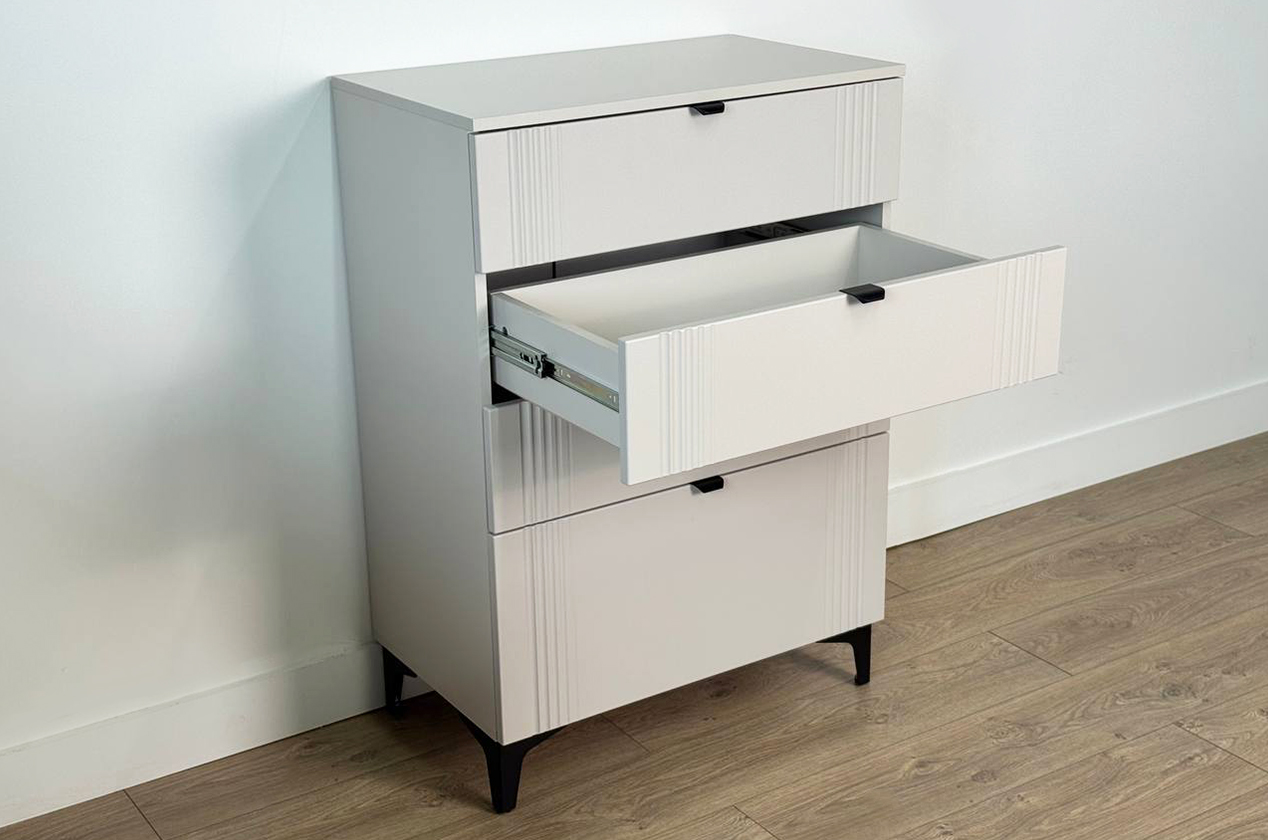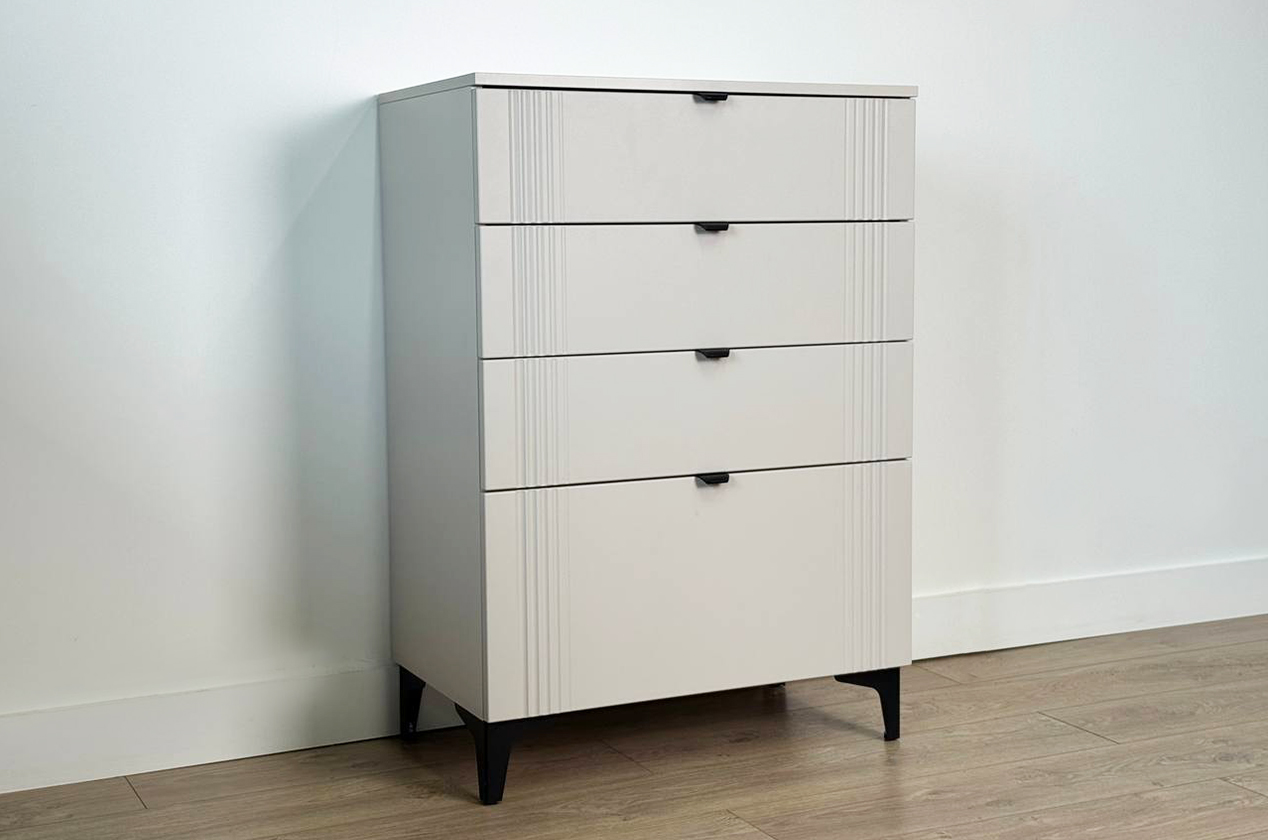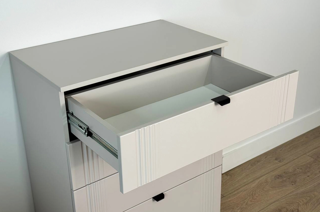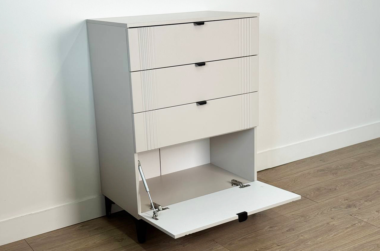 • Стиль и долговечность: Корпус из прочного ЛДСП и элегантный фасад из МДФ с декоративной фрезеровкой и защитной пленкой ПВХ.