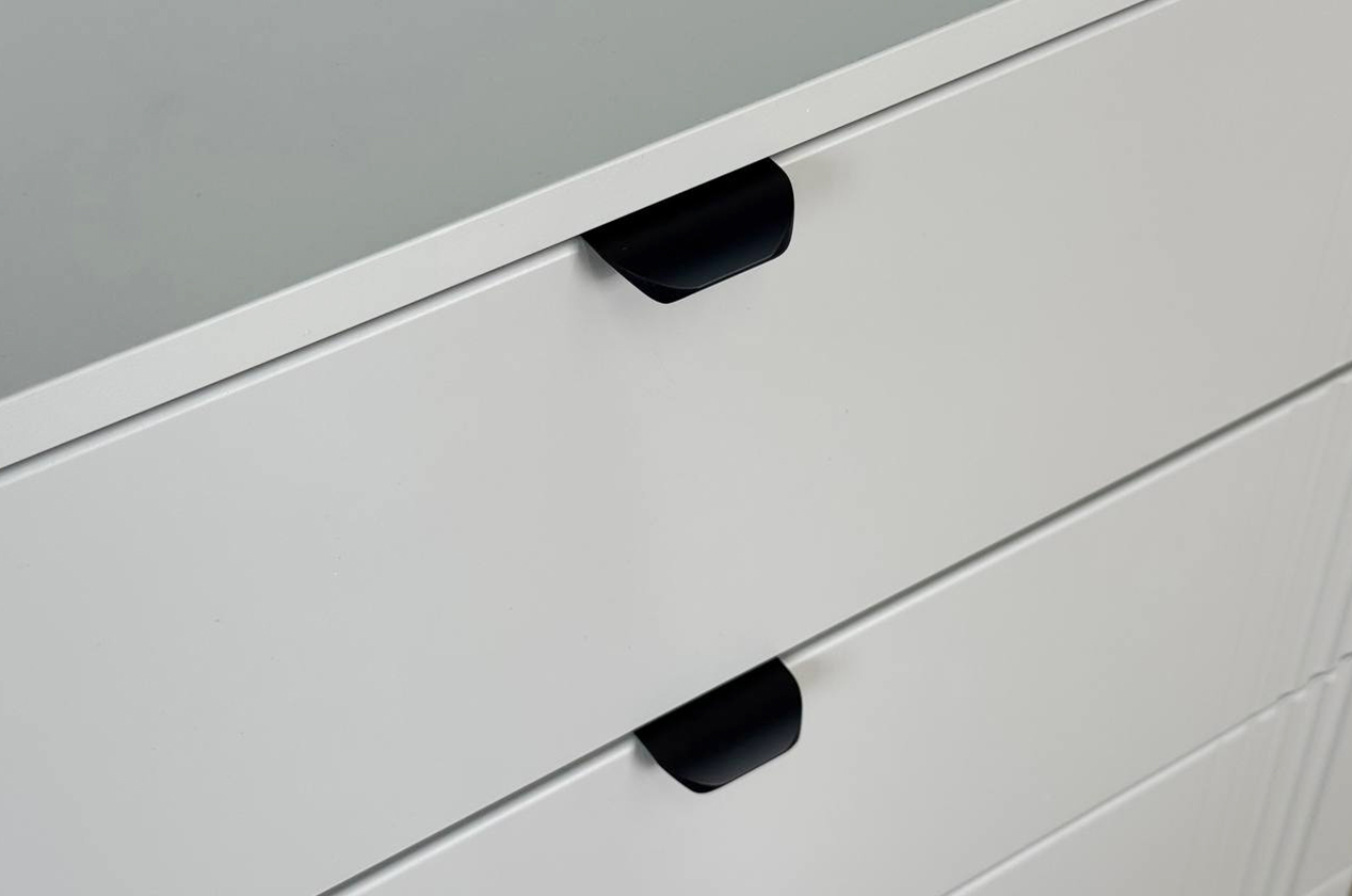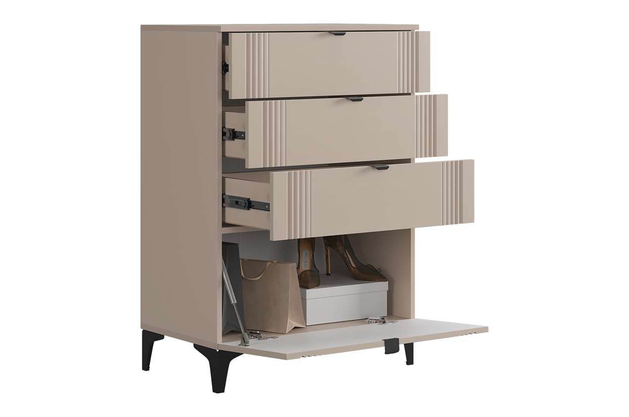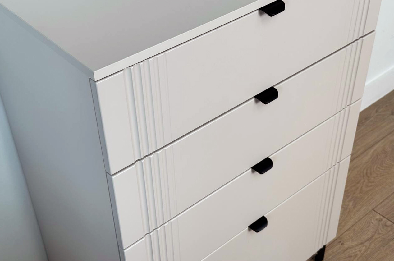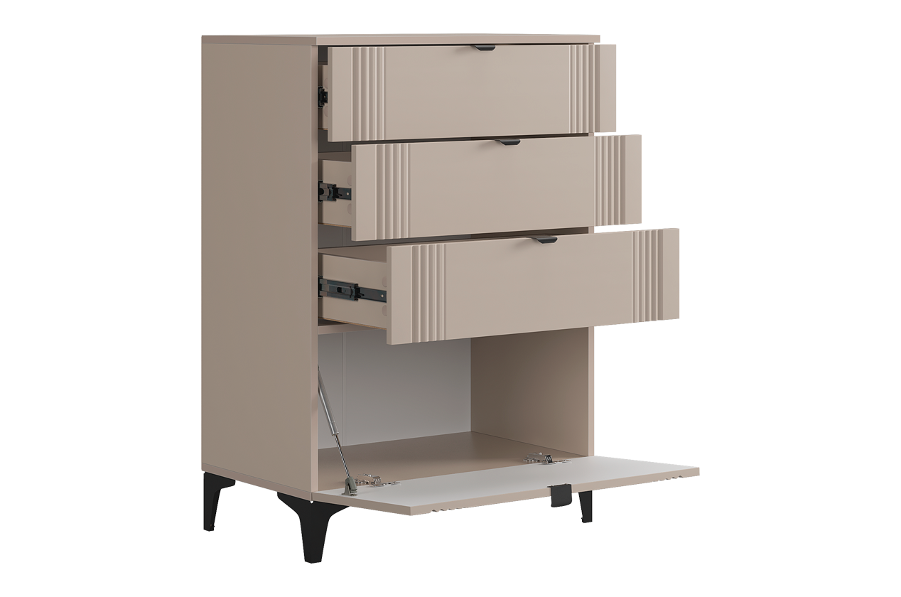 • Стиль и долговечность: Корпус из прочного ЛДСП и элегантный фасад из МДФ с декоративной фрезеровкой и защитной пленкой ПВХ.