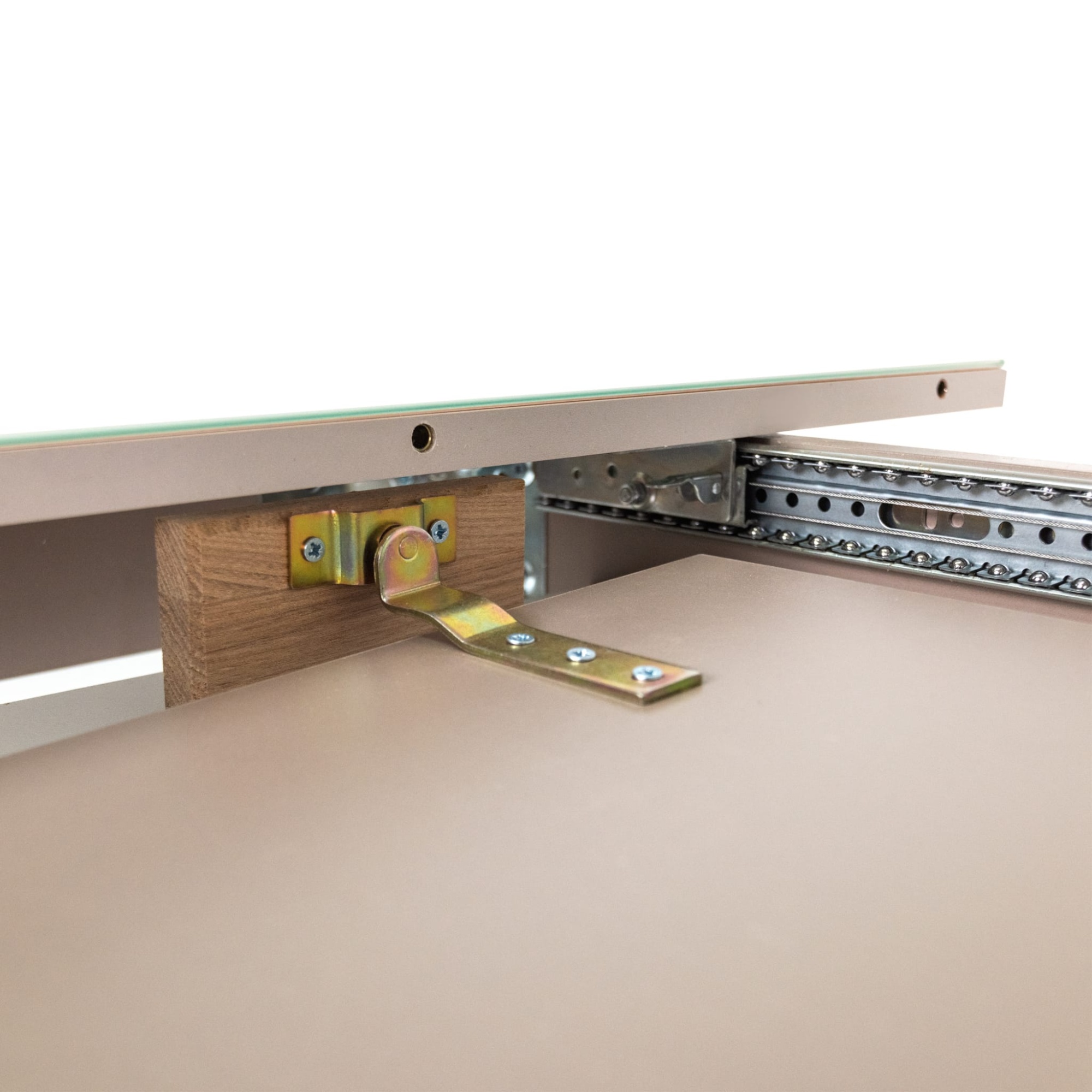 Стол полуовальной формы со стеклянной поверхностью – отличное решение для современных интерьеров. Скругленная форма углов эргономична для пространства дома, а отражающая поверхность поможет гармонично вписаться в интерьер и добавит больше света. Материал столешницы из ЛДСП + стекло, цвет – белый. Благодаря механизму трансформации стол увеличивается на 550 мм, вставка из ЛДСП белого цвета. Вставка стола хранится внутри.