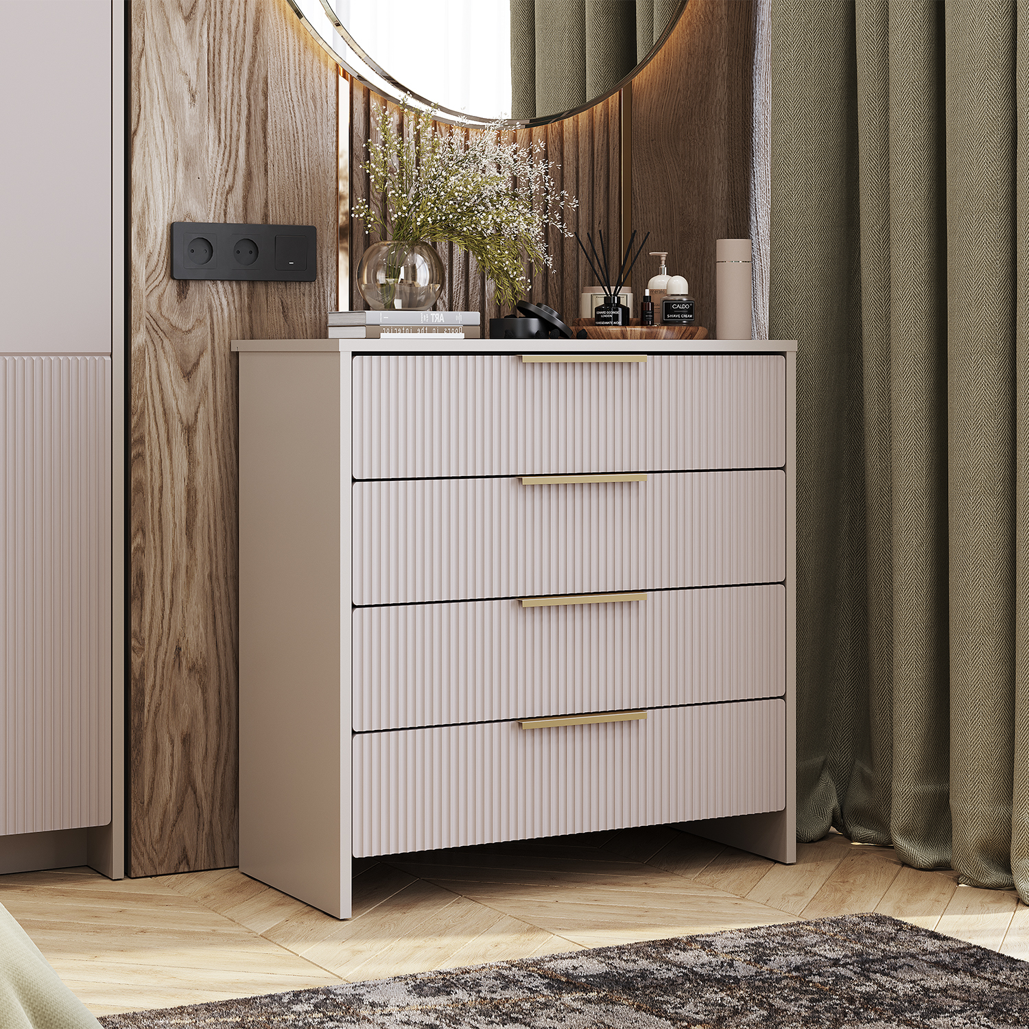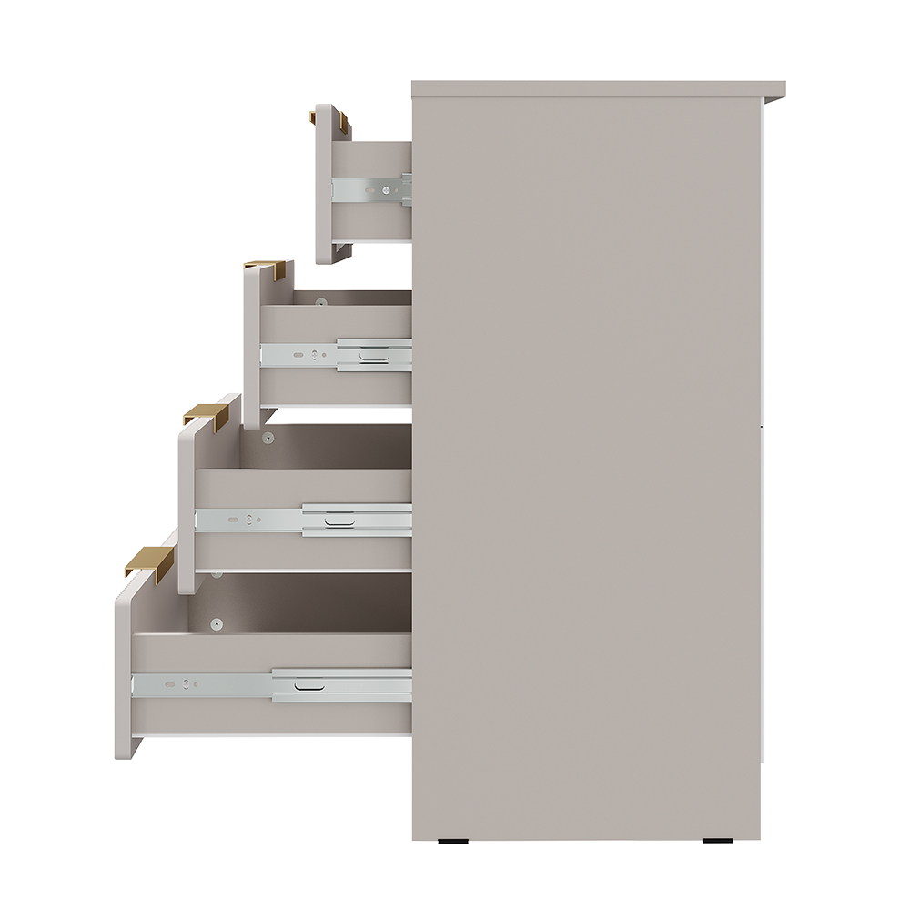 Лаконичный дизайн и отсутствие лишних деталей облегчают уход за комодом и делают его универсальным дополнением любого интерьера. Нежные оттенки фасада «айриш» и корпуса «кашемир» создают атмосферу уюта, а элегантная фрезеровка на фасаде добавляет модели изысканности и подчеркивает текстуру МДФ.