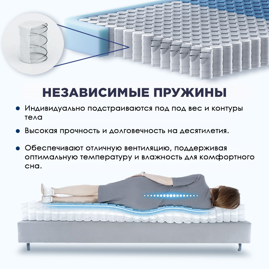 Независимый пружинный блок: Каждая пружина работает автономно, точечно подстраиваясь под вес и изгибы вашего тела. Это гарантирует безупречную ортопедическую поддержку, отсутствие эффекта «гамака» и абсолютную бесшумность. Блок обеспечивает идеальную циркуляцию воздуха, поддерживая оптимальный микроклимат для сна.