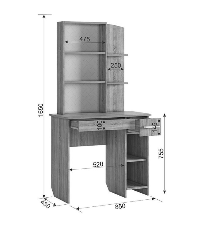 Зеркало прячет за собой две полочки. Под столешницей есть выдвижной ящик, рядом тумба с еще одним ящиком и шкафчиком. Модель можно дополнить  пуфиком.